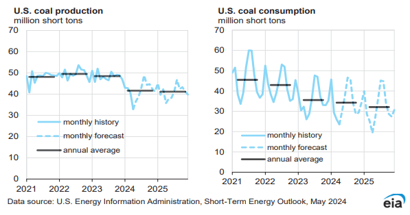 產(chǎn)量方面,《短期能源展望》報(bào)告預(yù)計(jì),2024年,美國煤炭產(chǎn)量接近5億短噸,高于前一月預(yù)期值4.852億短噸,但較2023年的5.816億短噸下降14.1%。2025年,美國煤炭產(chǎn)量預(yù)計(jì)為4.936億短噸,同比下降1.16%。