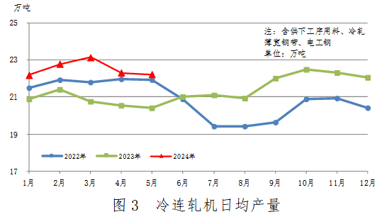 中厚板軋機、熱連軋機、冷連軋機日均產(chǎn)量變化見圖1、圖2、圖3。