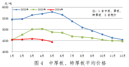 5月份,中厚板產(chǎn)量560萬噸,同比減少4萬噸,下降0.7%,產(chǎn)量由升轉(zhuǎn)降;銷售555萬噸,其中出口42萬噸,產(chǎn)銷率99.0%;售價4387元/噸,比上月下跌101元/噸。累計產(chǎn)量2580萬噸,同比增加6萬噸,上升0.2%。中厚板、特厚板平均價格見圖4。