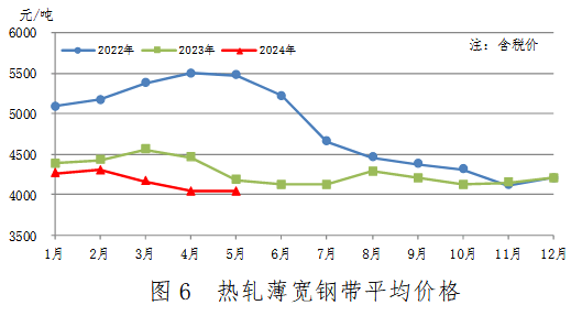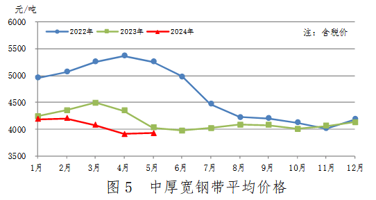 5月份,中厚寬鋼帶產(chǎn)量688萬噸,同比減少73萬噸,下降9.6%,降幅有所收窄;銷售693萬噸,其中出口63萬噸,產(chǎn)銷率100.7%;售價3923元/噸,比上月上漲17元/噸。累計產(chǎn)量3327萬噸,同比減少220萬噸,下降6.2%。中厚寬鋼帶平均價格見圖5。