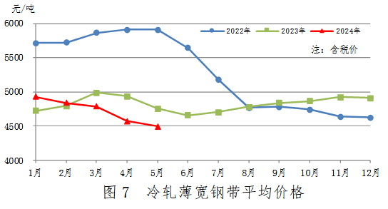 5月份,冷軋薄寬鋼帶產(chǎn)量357萬噸,同比增加26萬噸,上升7.7%,升幅繼續(xù)收窄;銷售350萬噸,其中出口15萬噸,產(chǎn)銷率97.8%;售價4496元/噸,比上月下跌76元/噸。累計產(chǎn)量1801萬噸,同比增加171萬噸,上升10.5%。冷軋薄寬鋼帶平均價格見圖7。