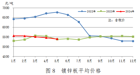 5月份,鍍鋅板產(chǎn)量228萬噸,同比增加22萬噸,上升10.7%,升幅有所擴大;銷售224萬噸,其中出口16萬噸,產(chǎn)銷率98.1%;售價5401元/噸,比上月下跌62元/噸。累計產(chǎn)量1123萬噸,同比增加99萬噸,上升9.6%。鍍鋅板平均價格見圖8。