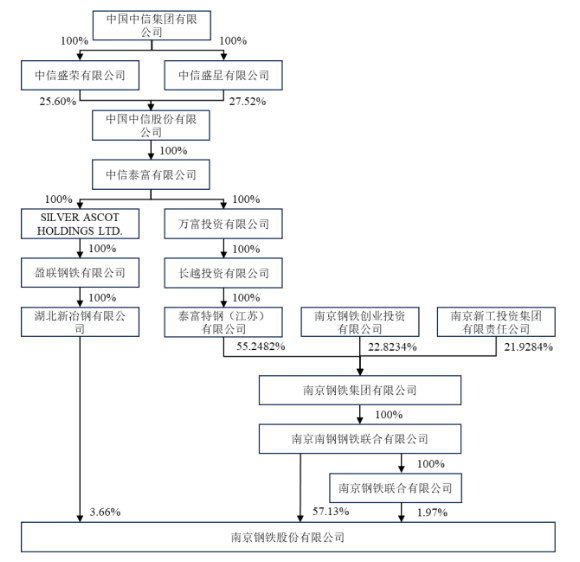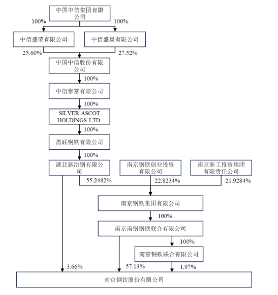 本次交易完成后,南鋼股份的控股股東和實際控制人未發(fā)生變化,控股股東仍為南京鋼聯(lián),實際控制人仍為中信集團。屆時,南鋼股份股權控制關系將如下所示: