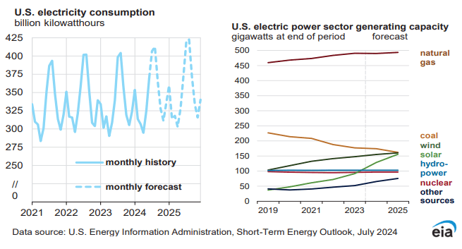 美國(guó)能源信息署(EIA)7月9日發(fā)布的最新《短期能源展望》報(bào)告顯示,預(yù)計(jì)2024和2025年,美國(guó)電力需求將連續(xù)創(chuàng)下歷史新高。