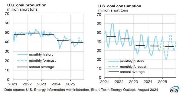 產(chǎn)量方面,《短期能源展望》報(bào)告預(yù)計(jì),2024年,美國煤炭產(chǎn)量為4.99億短噸,低于前一月預(yù)期值5.097億短噸,較2023年的5.775億短噸下降13.59%。2025年,美國煤炭產(chǎn)量預(yù)計(jì)為4.74億短噸,同比下降5.01%。