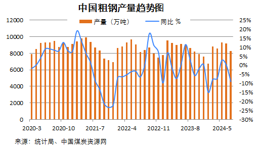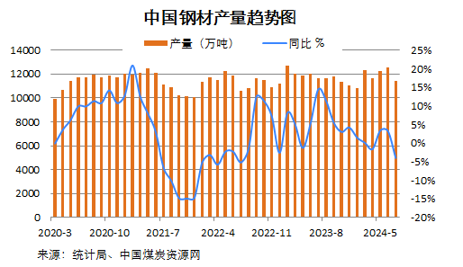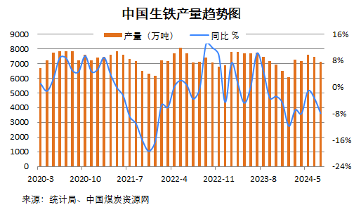 國(guó)家統(tǒng)計(jì)局?jǐn)?shù)據(jù)顯示,2024年1-7月份,全國(guó)焦炭、粗鋼和生鐵產(chǎn)量同比依舊下降,而鋼材產(chǎn)量仍同比為正。具體來(lái)看: