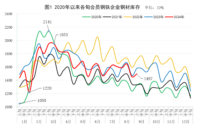 2024年9月上旬,重點統(tǒng)計鋼鐵企業(yè)(以下簡稱“重點企業(yè)”)鋼材庫存量1497萬噸,環(huán)比上一旬增加43萬噸,增長2.9%;比年初增加261萬噸,上升21.1%;比上月同旬減少93萬噸,下降5.8%;比去年同旬減少83萬噸,下降5.3%,比前年同旬減少209萬噸,下降12.3%(見圖1)。