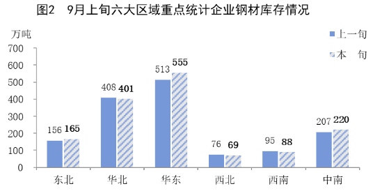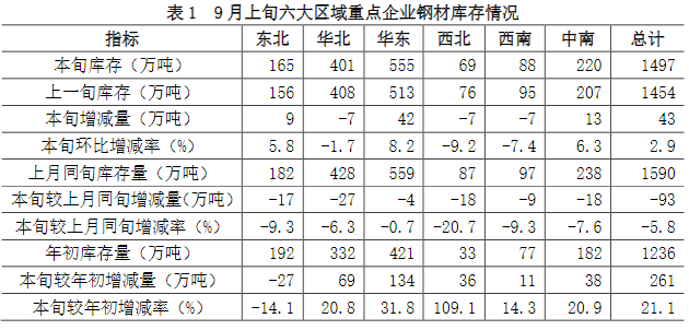 9月上旬,西北、西南、華北地區(qū)重點企業(yè)鋼材庫存較上一旬出現(xiàn)不同程度下降,其他地區(qū)有所增加,具體情況為: