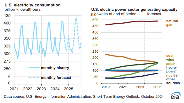 能源信息署預(yù)計(jì),2024和2025年,美國(guó)電力需求預(yù)計(jì)將分別達(dá)到40930億千瓦時(shí)和41630億千瓦時(shí),但這略低于9月份發(fā)布的需求預(yù)期值。