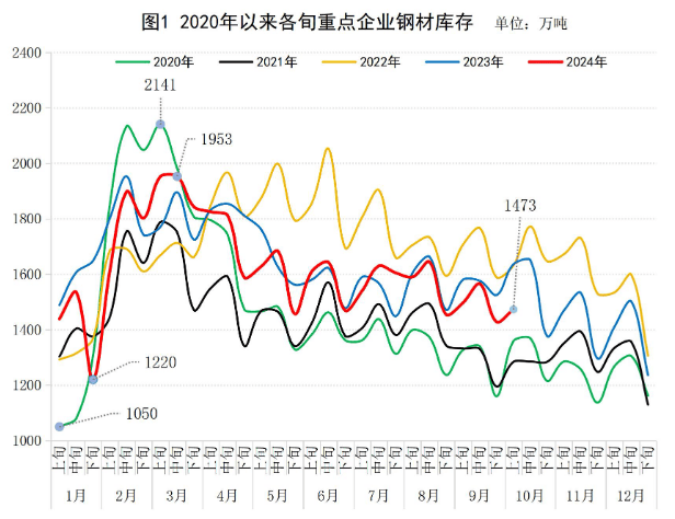 2024年10月上旬,重點(diǎn)統(tǒng)計(jì)鋼鐵企業(yè)(以下簡(jiǎn)稱(chēng)“重點(diǎn)企業(yè)”)鋼材庫(kù)存量1473萬(wàn)噸,環(huán)比上一旬增加45萬(wàn)噸,上升3.2%;比年初增加237萬(wàn)噸,上升19.2%;比上月同旬減少24萬(wàn)噸,下降1.6%;比去年同旬減少163萬(wàn)噸,下降10.0%,比前年同旬減少159萬(wàn)噸,下降9.7%(見(jiàn)圖1)。