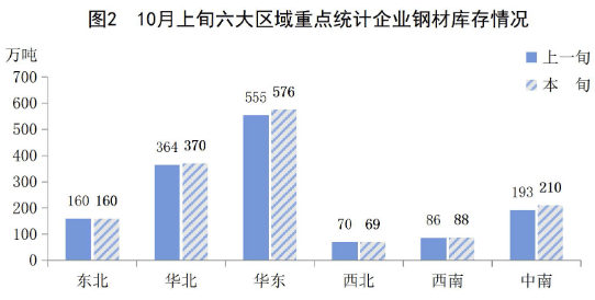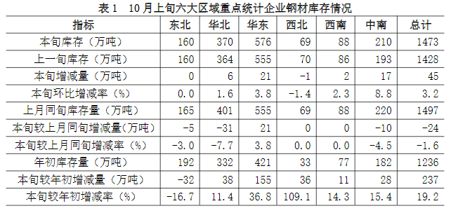 10月上旬,除東北地區(qū)重點(diǎn)企業(yè)鋼材庫(kù)存較上一旬基本持平,西北地區(qū)略有下降外,其它地區(qū)均有不同程度增長(zhǎng)(見(jiàn)圖2、表1),具體情況為: