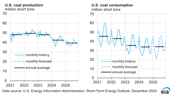 2025年,美國煤炭產(chǎn)量預(yù)計(jì)為4.723億短噸,同比下降7.17%,同樣高于前一月預(yù)期值4.691億短噸。
