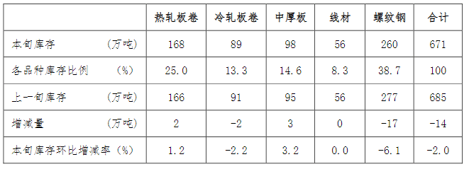 12月中旬,21個(gè)城市5大品種鋼材社會庫存671萬噸,環(huán)比減少14萬噸,下降2.0%,庫存再次探底;比年初減少58萬噸,下降8.0%;比上年同期減少48萬噸,下降6.7%。