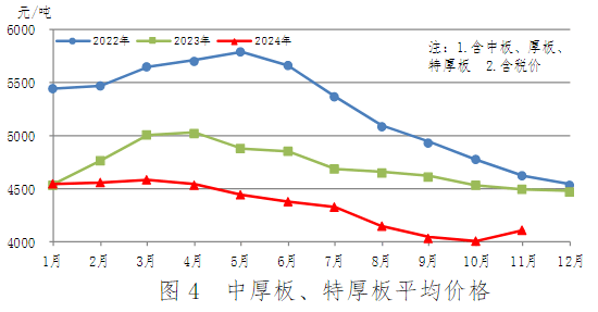 11月份,中厚板產量506萬噸,同比增加4萬噸,上升0.8%;銷售505萬噸,其中出口36萬噸,產銷率99.8%;售價4071元/噸,比上月上漲111元/噸。累計產量5840萬噸,同比增加162萬噸,上升2.9%。中厚板、特厚板平均價格見圖4。
