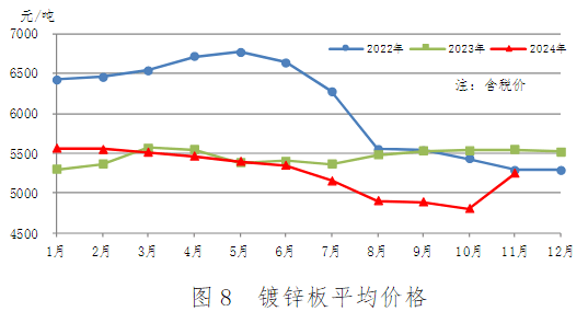 11月份,鍍鋅板產量232萬噸,同比增加9萬噸,上升4.2%;銷售234萬噸,其中出口16萬噸,產銷率100.9%;售價5250元/噸,比上月上漲445元/噸。累計產量2490萬噸,同比增加173萬噸,上升7.5%。鍍鋅板平均價格見圖8。