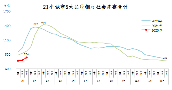 1月下旬,21個(gè)城市5大品種鋼材社會(huì)庫存734萬噸,環(huán)比增加60萬噸,上升8.9%,庫存升幅擴(kuò)大;比年初增加75萬噸,上升11.4%;比上年同期減少132萬噸,下降15.2%。