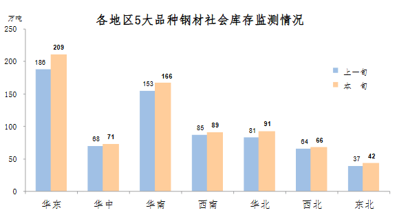 1月下旬,分地區(qū)來看,七大區(qū)域鋼材庫存環(huán)比均有不同程度上升。具體情況為:華東庫存環(huán)比增加23萬噸,上升12.4%,為增量最大地區(qū);華南增加13萬噸,上升8.5%;華北增加10萬噸,上升12.3%;東北增加5萬噸,上升13.5%,為增幅最大地區(qū);西南增加4萬噸,上升4.7%;華中增加3萬噸,上升4.4%;西北增加2萬噸,上升3.1%。
