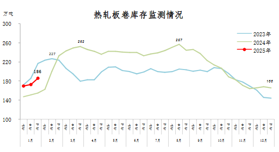 1月下旬,熱軋板卷庫存186萬噸,環(huán)比增加13萬噸,上升7.5%,庫存上升幅度擴(kuò)大;比年初增加20萬噸,上升12.0%;比上年同期增加31萬噸,上升20.0%。