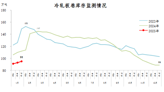 1月下旬,冷軋板卷庫存95萬噸,環(huán)比增加2萬噸,上升2.2%,庫存繼續(xù)小幅上升;比年初增加6萬噸,上升6.7%;比上年同期減少17萬噸,下降15.2%。