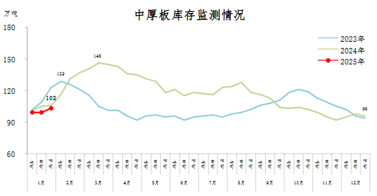 1月下旬,中厚板庫存103萬噸,環(huán)比增加4萬噸,上升4.0%;比年初增加7萬噸,上升7.3%;比上年同期減少3萬噸,下降2.8%。