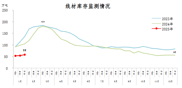 1月下旬,線材庫存58萬噸,環(huán)比增加4萬噸,上升7.4%,庫存升幅擴(kuò)大;比年初增加2萬噸,上升3.6%;比上年同期減少47萬噸,下降44.8%。