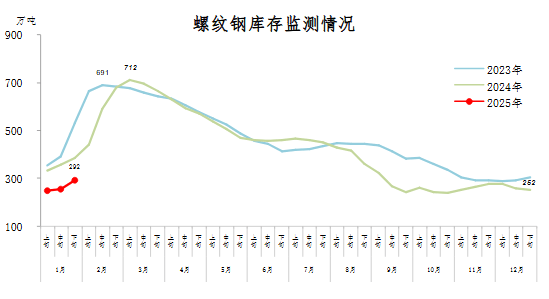 1月下旬,螺紋鋼庫存292萬噸,環(huán)比增加37萬噸,上升14.5%,庫存增速較快;比年初增加40萬噸,上升15.9%;比上年同期減少96萬噸,下降24.7%。