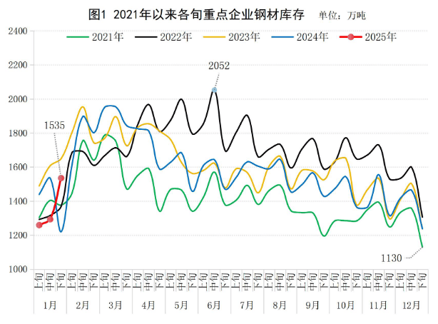2025年1月下旬,重點(diǎn)統(tǒng)計(jì)鋼鐵企業(yè)(以下簡(jiǎn)稱“重點(diǎn)企業(yè)”)鋼材庫存量1535萬噸,環(huán)比上一旬增加242萬噸,增長(zhǎng)18.7%;比年初增加298萬噸,增長(zhǎng)24.1%;比上月同旬增加298萬噸,增長(zhǎng)24.1%;比去年同旬增加315萬噸,增長(zhǎng)25.8%,比前年同旬減少114萬噸,下降6.9%(見圖1)。