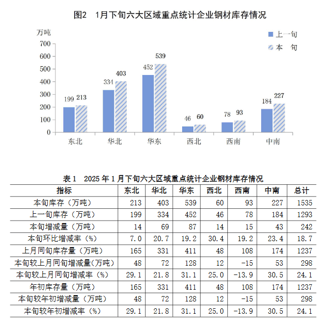 1月下旬六大地區(qū)重點(diǎn)企業(yè)鋼材庫存較上一旬均有不同程度增長(zhǎng)(見圖2、表1),具體情況為: