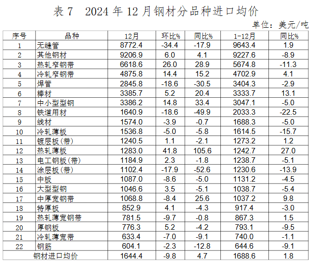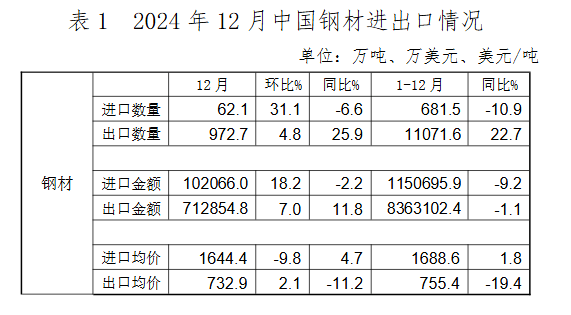 2024年12月,我國出口鋼材972.7萬噸,環(huán)比增長4.8%,出口均價732.9美元/噸,環(huán)比小幅回升2.1%。1-12月,我國累計出口鋼材11071.6萬噸,同比增長22.7%,出口均價755.4美元/噸,同比下降19.4%。12月,我國進(jìn)口鋼材62.1萬噸,環(huán)比增長31.1%,進(jìn)口均價1644.4美元/噸,環(huán)比下降9.8%。1-12月,我國累計進(jìn)口鋼材681.5萬噸,同比下降10.9%,進(jìn)口均價1688.6美元/噸,同比增長1.8%。
