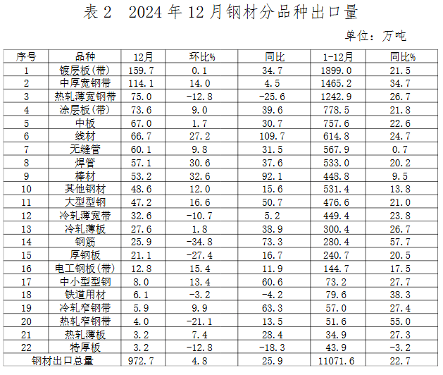 2024年,出口量1000萬噸以上的品種有鍍層板、中厚寬鋼帶和熱軋薄寬鋼帶,出口量500至1000萬噸的品種包括涂層板、中板、線材、無縫管和焊管。除特厚板外,其他21類品種出口均不同幅度增長。