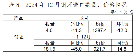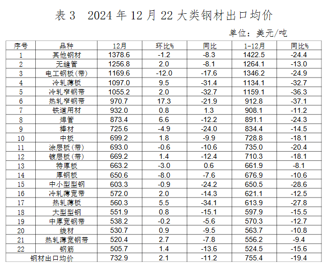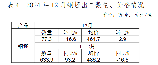 2024年12月,棒線材、焊管出口環(huán)比增長幅度較大,熱軋薄寬鋼帶、冷軋薄寬鋼帶、厚鋼板等板材類產(chǎn)品出口環(huán)比下降,鋼筋出口環(huán)比大幅下降。出口的主要品種為鍍層板(帶)、中厚寬鋼帶、熱軋薄寬鋼帶、涂層板(帶)和中板,占12月鋼材出口總量的50.3%。熱軋板卷、鍍層板等主要品種出口均價小幅回升,電工鋼出口數(shù)量環(huán)比增長,價格大幅下降。12月鋼坯出口量環(huán)比下降,價格環(huán)比上漲。