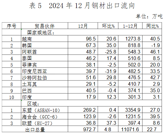12月,我國鋼材出口的主要區(qū)域仍集中在以韓國、東盟以及海合會國家為代表的亞洲地區(qū),對多數(shù)國家出口環(huán)比出現(xiàn)下降。