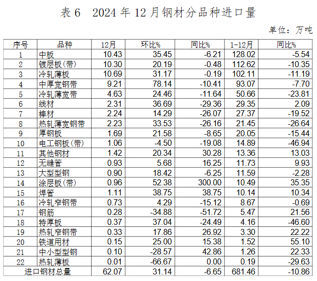 2024年,我國鋼材的主要進(jìn)口來源及結(jié)構(gòu)仍保持穩(wěn)定,進(jìn)口產(chǎn)品以板材為主,日韓仍是我國鋼材進(jìn)口主要來源。2024年,我國鋼材進(jìn)口數(shù)量持續(xù)下降,進(jìn)口量較大的品種為中板、鍍層板(帶)、冷軋薄板、中厚寬鋼帶和冷軋薄寬鋼帶。進(jìn)口量較大的品種全年進(jìn)口量同比均有較大幅度下降。12月進(jìn)口環(huán)比增幅較大,主要品種環(huán)比進(jìn)口量均有較大幅度增長。