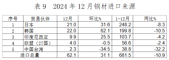 鋼材進(jìn)口來源持續(xù)穩(wěn)定,12月自日本、韓國和印度尼西亞進(jìn)口鋼材數(shù)量環(huán)比增幅較大,自中國臺灣進(jìn)口持續(xù)下降。日本、韓國和印度尼西亞是我鋼材進(jìn)口的主要來源,2024年自上述三國進(jìn)口占我國鋼材進(jìn)口總量的81.0%。