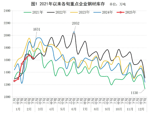 2025年2月下旬,重點(diǎn)統(tǒng)計(jì)鋼鐵企業(yè)(以下簡(jiǎn)稱“重點(diǎn)企業(yè)”)鋼材庫(kù)存量1631萬(wàn)噸,環(huán)比上一旬減少42萬(wàn)噸,下降2.5%;比年初增加394萬(wàn)噸,增長(zhǎng)31.9%;比上月同旬增加96萬(wàn)噸,增長(zhǎng)6.3%;比去年同旬減少171萬(wàn)噸,下降9.5%,比前年同旬減少111萬(wàn)噸,下降6.4%(見圖1)。